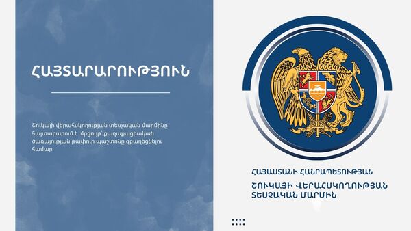 Շուկայի վերահսկողության տեսչական մարմինը հայտարարում է մրցույթ՝ Տեխնիկական կանոնակարգերով սահմանված պահանջների և թանկարժեք մետաղների վերահսկողության վարչության մասնագետի (պաշտոնի ծածկագիրը' 69-27.2-Մ6-1) քաղաքացիական ծառայության թափուր պաշտոնն զբաղեցնելու համար: Շուկ